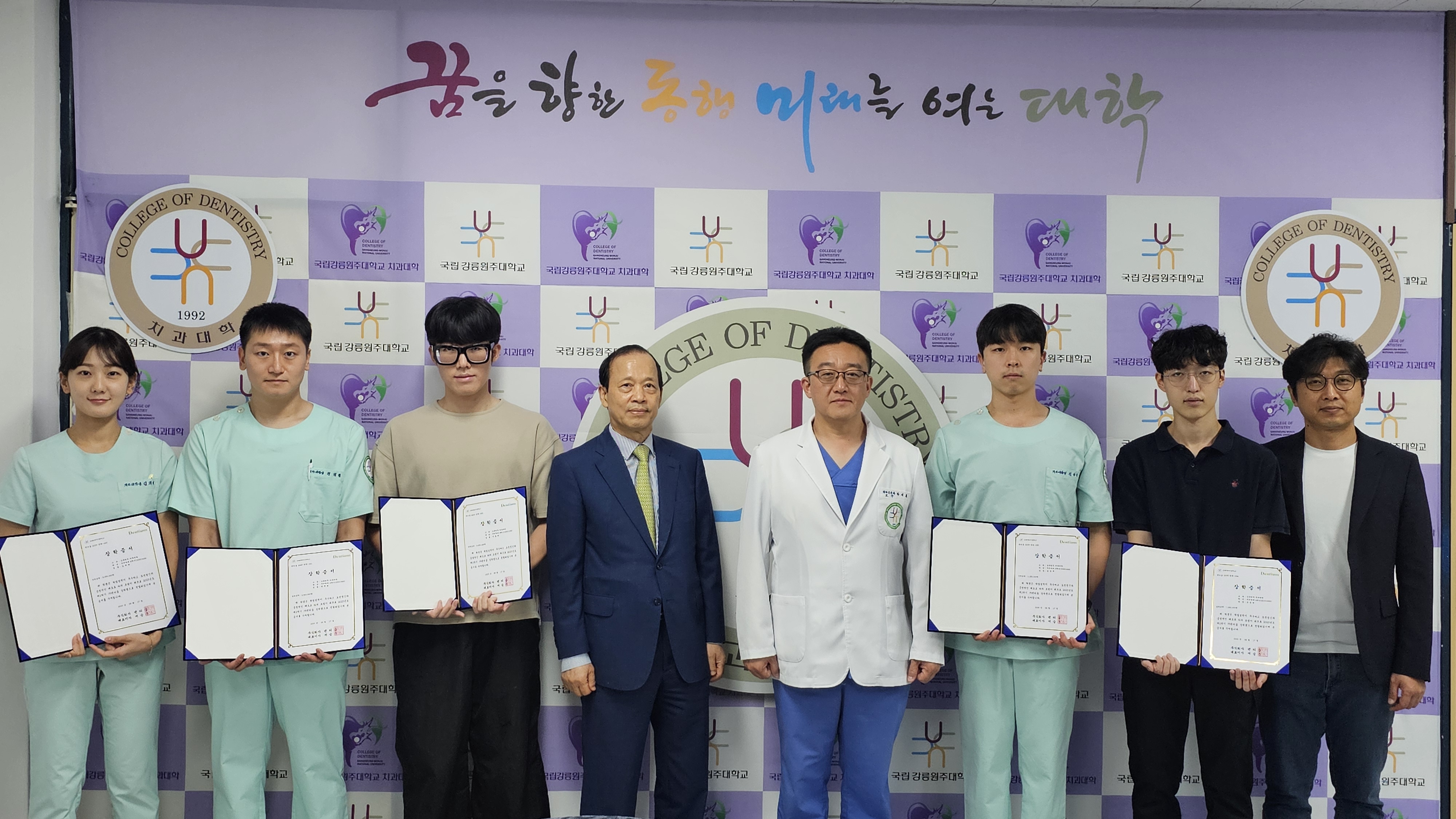 ㈜덴티움의 이창영 사장과 최성호 강원지점장이 국립강릉원주대학교 치과대학 치의(예)학과를 방문한 가운데 개최된 본 행사에서는 2025학년도 덴티움 장학생으로 선정된 학생에게 이창영 사장이 직접 장학증서를 수여하고 격려하였다.