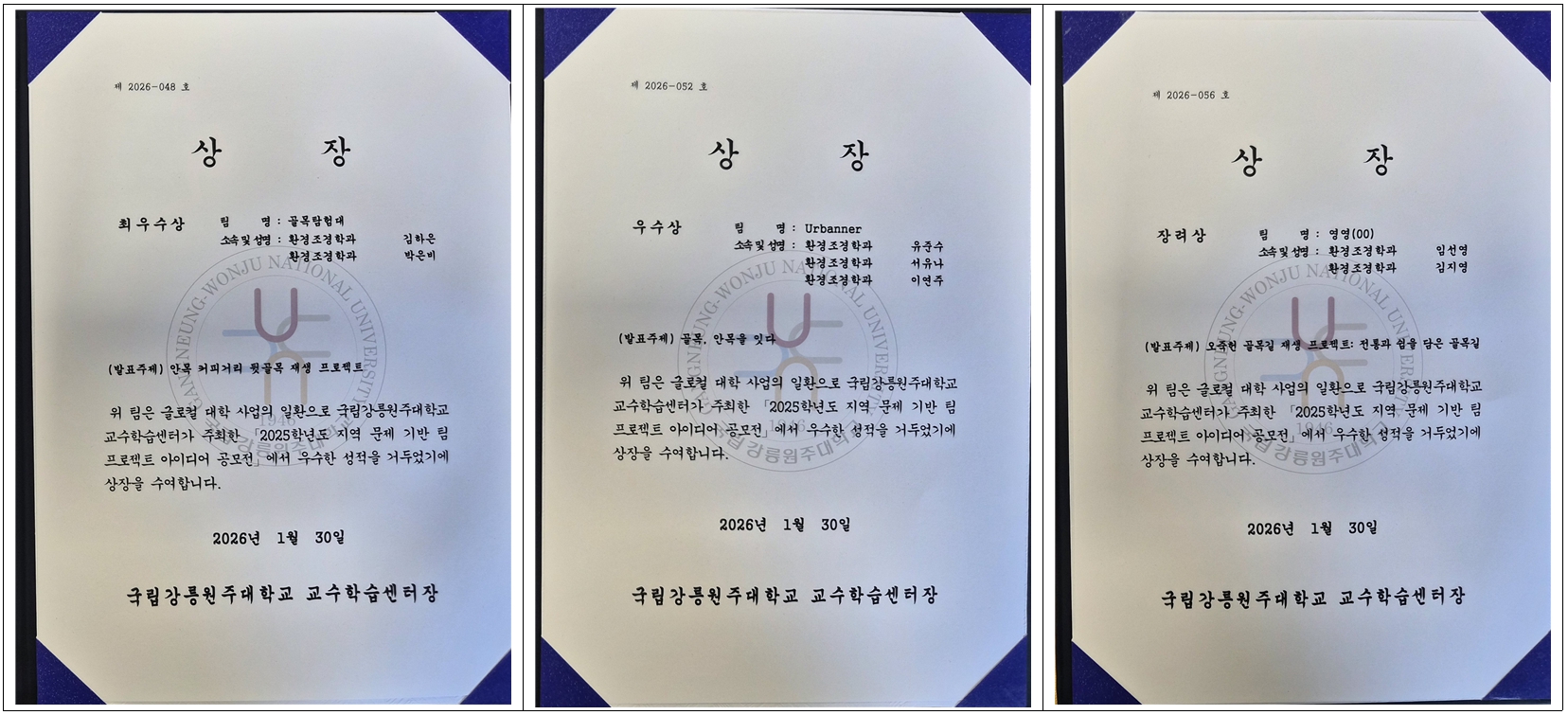 국립강릉원주대학교 환경조경학과 학생들이 교수학습센터가 주관한 「2025학년도 지역 문제 기반 팀 프로젝트 아이디어 공모전」에서 우수한 성과를 거두었다.