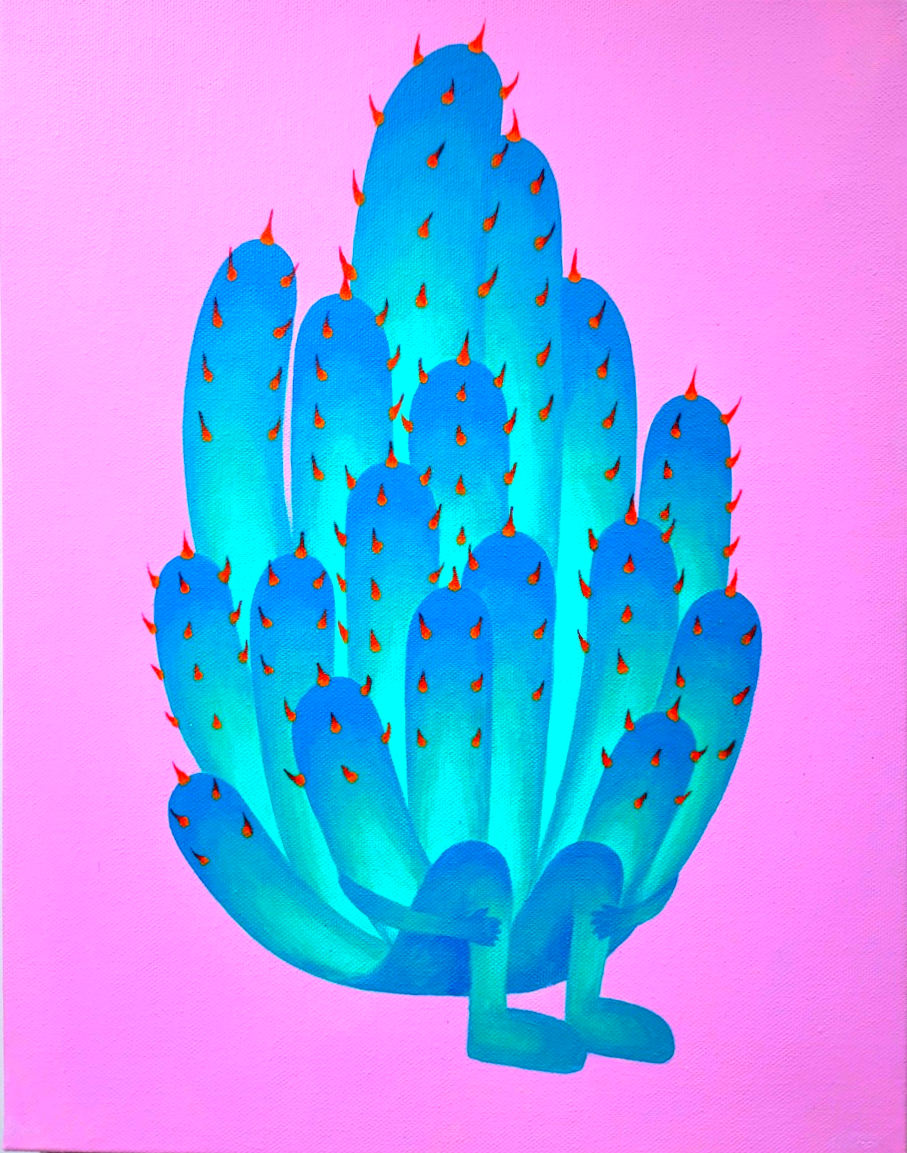 "작업 주제는 콤플렉스를 계속 마주하며 스스로를 치유하는 과정이다. 평소 피부 상태를 외면하다가 상태가 악화되면 콤플렉스를 다시 깨닫게 되는 과정에서 더욱 큰 스트레스를 받아왔다. 이 주제가 정해질 때 피부는 외면할 수 없을 정도로 악화된 상태였다. 스트레스에서 벗어나기 위해 그림으로 피부를 표현하며 콤플렉스를 마주하기로 결심했다. 피부에 가시가 박힌 것 같은 따가움이 느껴졌고 움직일 때마다 갈라지는 것이 보였다. 따가움은 선인장과 가시로, 갈라지는 피부는 사막으로 표현했다."