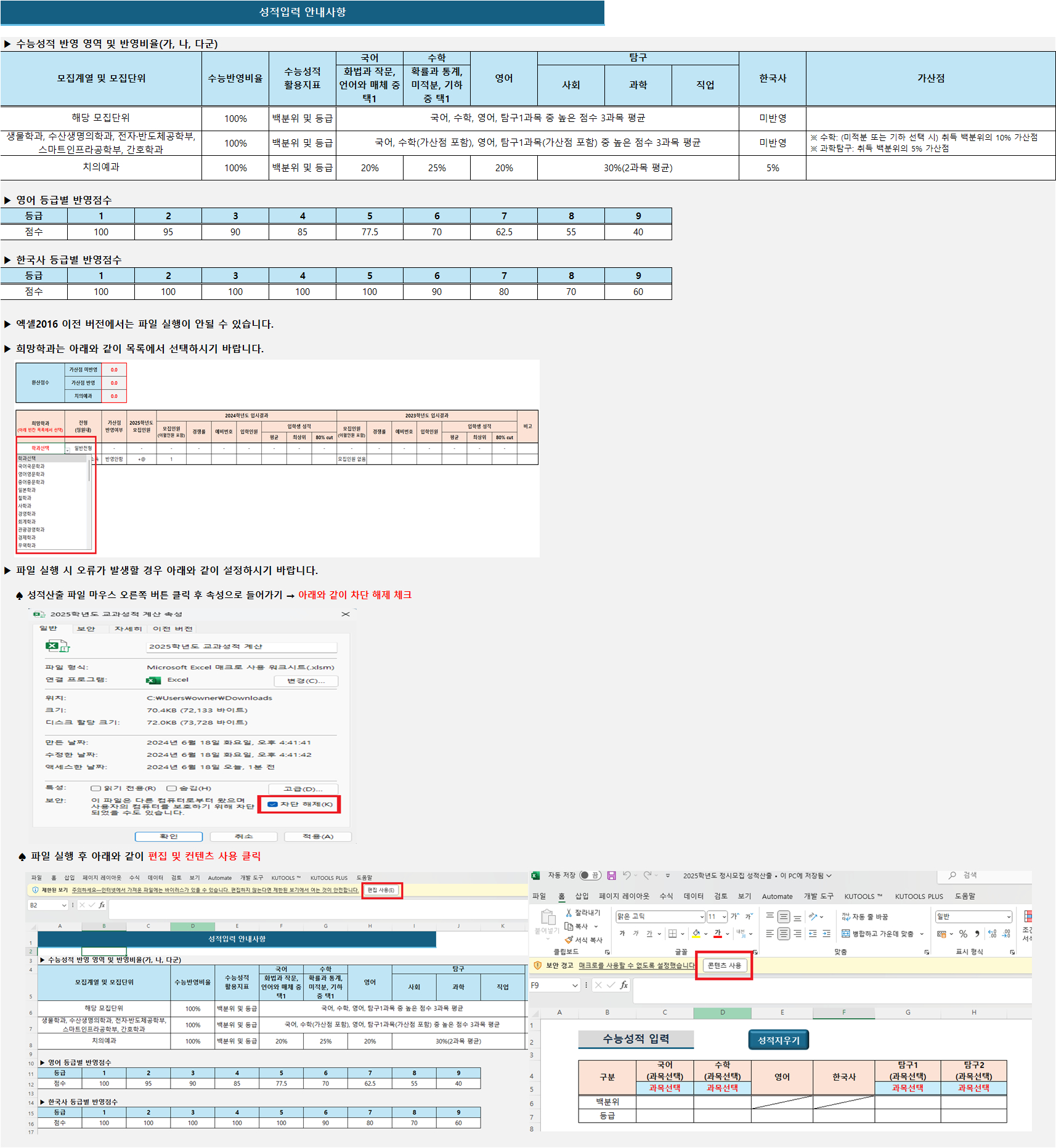 2025학년도 우리대학의 정시모집과 관련하여 수능성적을 산출해보고 싶은 지원자들은 첨부된 파일을 다운받아서 확인해보시기 바랍니다.