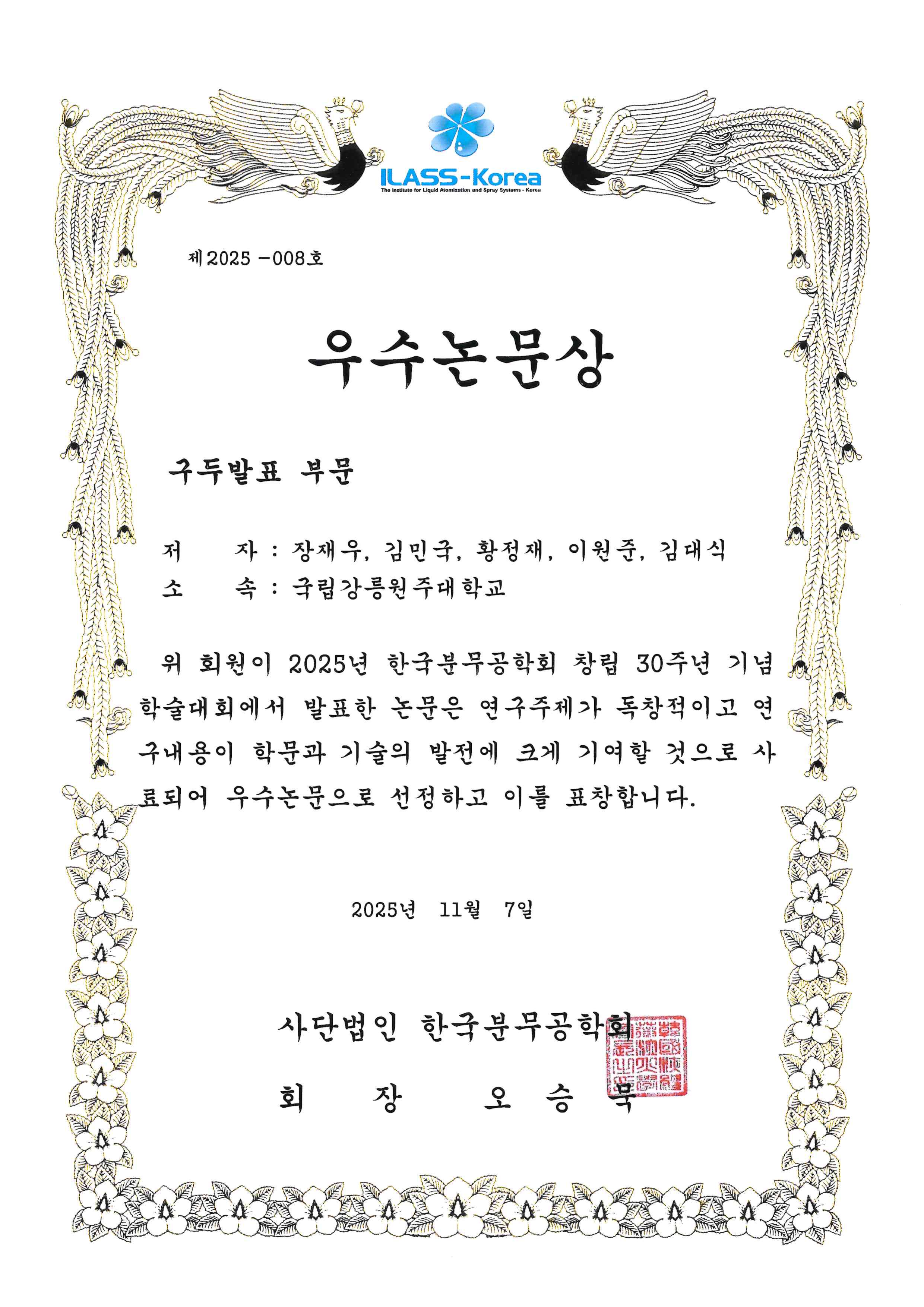 국립강릉원주대학교 기계공학과 장재우(박사과정, 지도교수 김대식) 학생이 지난 11월 7일 오션스위츠 제주호텔에서 열린 ‘2025년도 한국분무공학회 창립 30주년 기념 학술대회’에서 구두발표 부문 ‘우수논문상’을 수상했다.