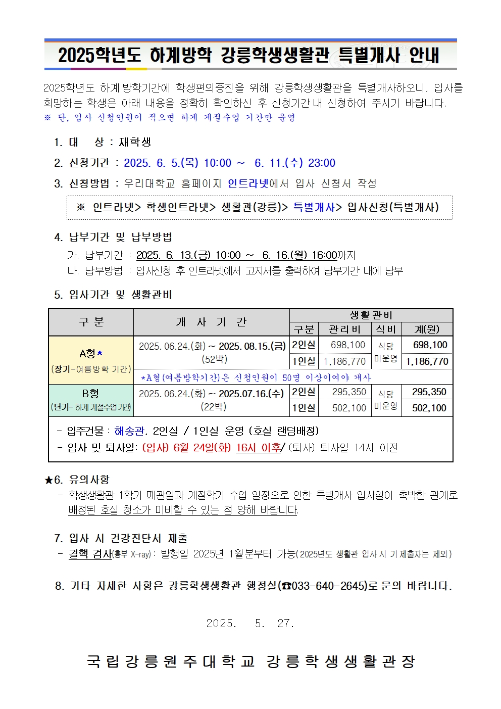 2025학년도 하계방학 강릉학생생활관 특별개사 안내