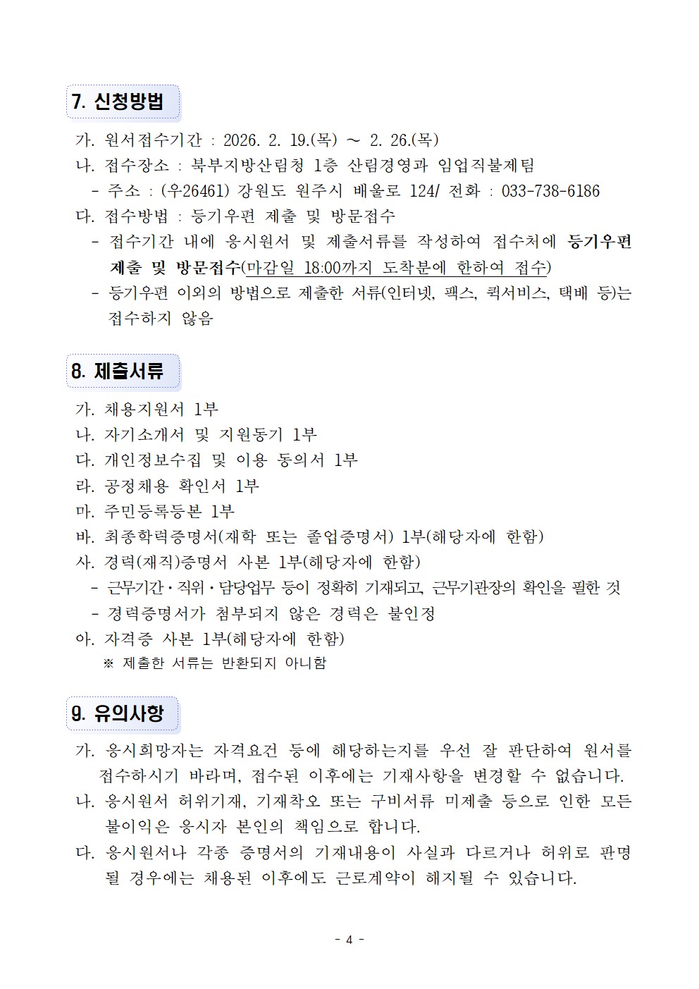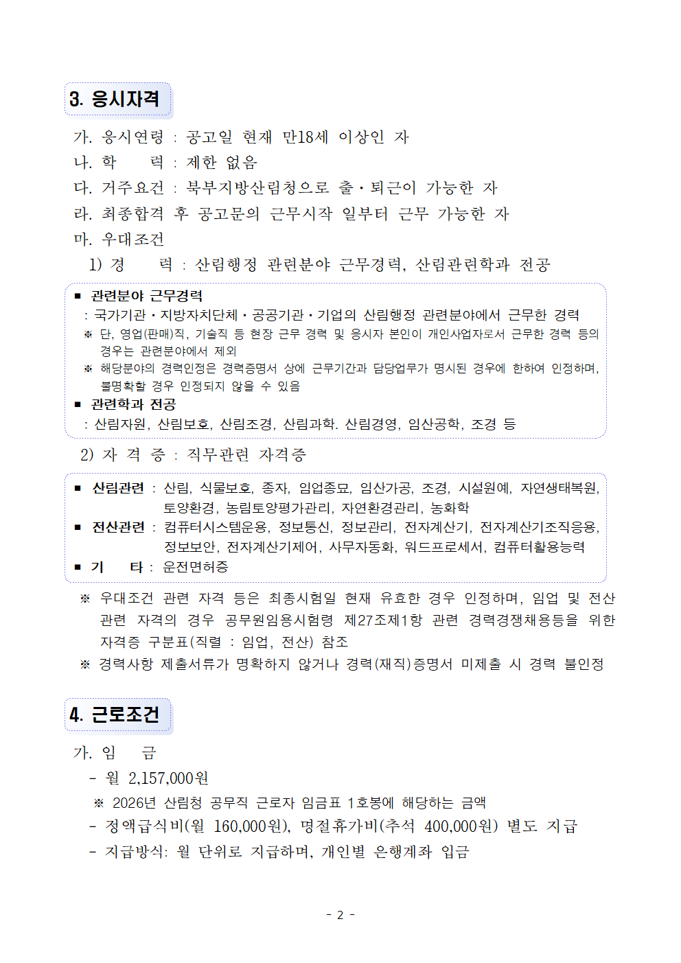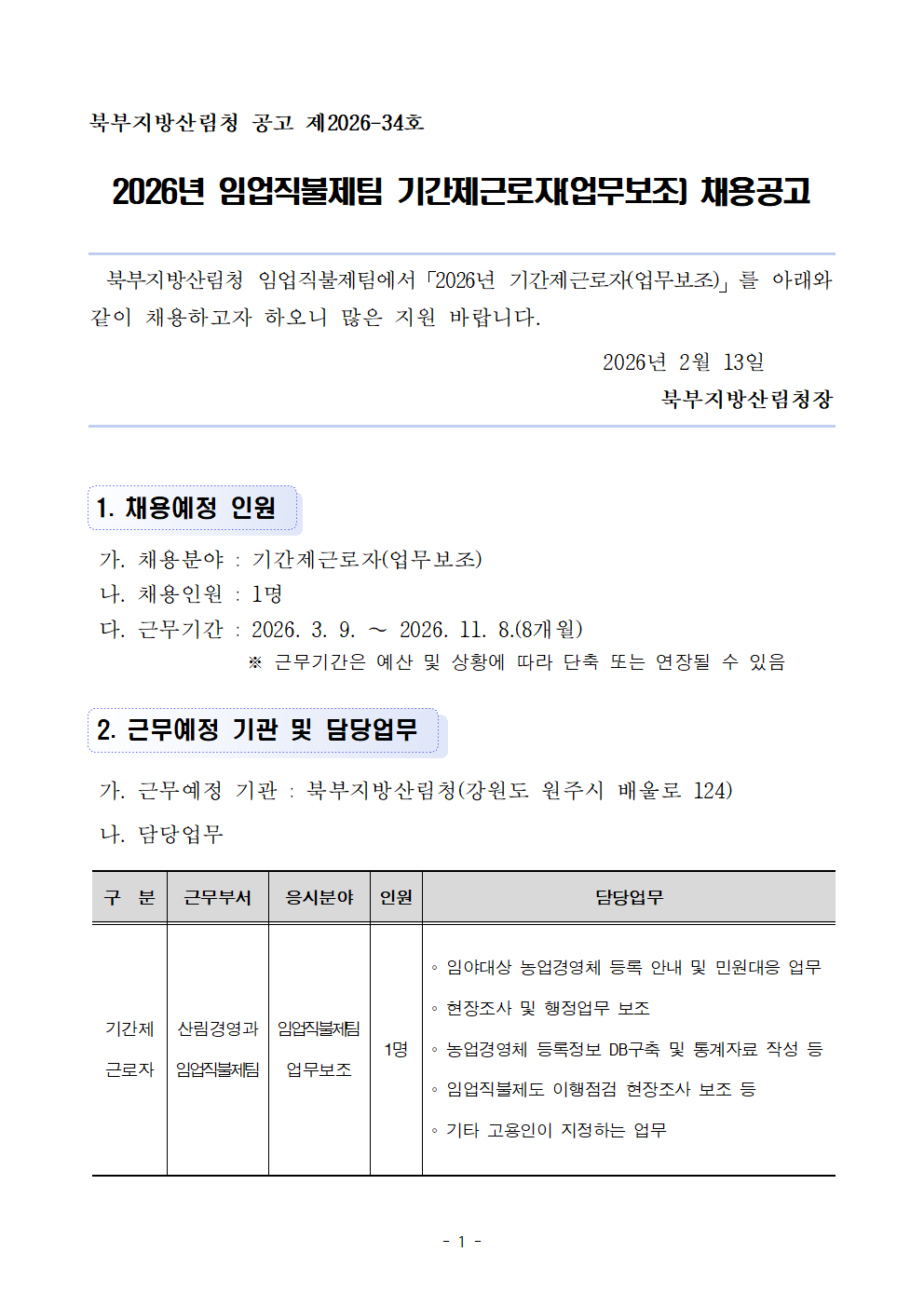 [북부지방산림청] 임업직불제 기간제근로자 채용 공고(~2/26)