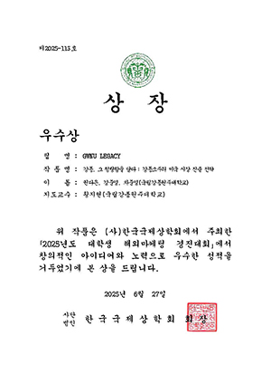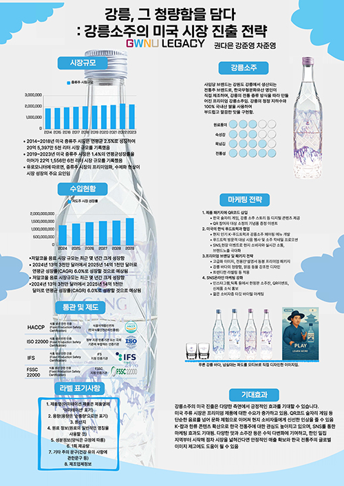 우수상은 ‘GWNU LEGACY’팀(권다은(21학번(팀장), 강준영(20학번), 차준영(21학번), 지도교수 황지현)이 ‘강릉, 그 청량함을 담다: 강릉소주의 미국 시장 진출 전략’발표를 통해 수상했다.