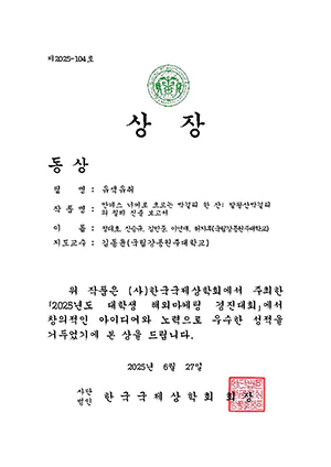 무역학과 윤재웅 학과장은 “이번 수상은 국립강릉원주대학교 무역학과의 글로벌 비즈니스 교육과 실무 중심의 역량 강화 노력이 결실을 맺은 것으로, 학생들의 창의적 기획력과 시장 분석 능력을 대외적으로 입증하는 계기가 되었다”며 “앞으로도 무역 전문 인재 양성을 위한 실천적 교육과 다양한 경진대회 참여를 지속적으로 확대해 나가겠다”고 말했다.