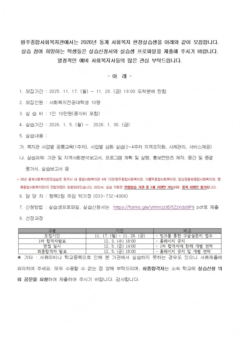 [2026-동계] 원주종합사회복지관 사회복지현장실습생 모집 공고(~11.28.)