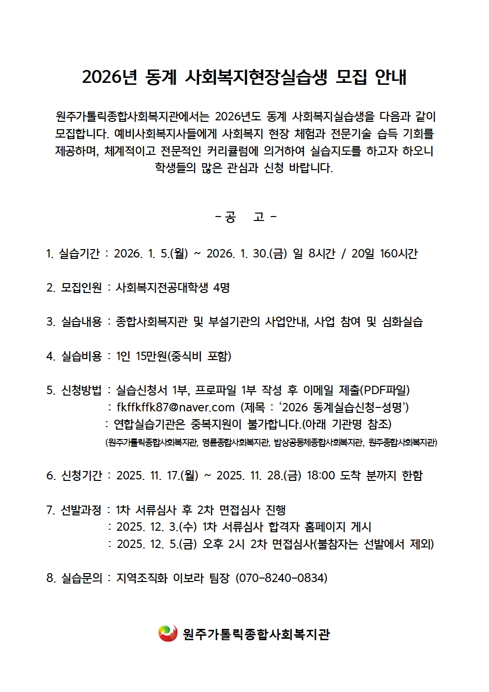 [2026-동계] 원주가톨릭종합사회복지 사회복지현장실습생 모집 공고(~11.28.)
