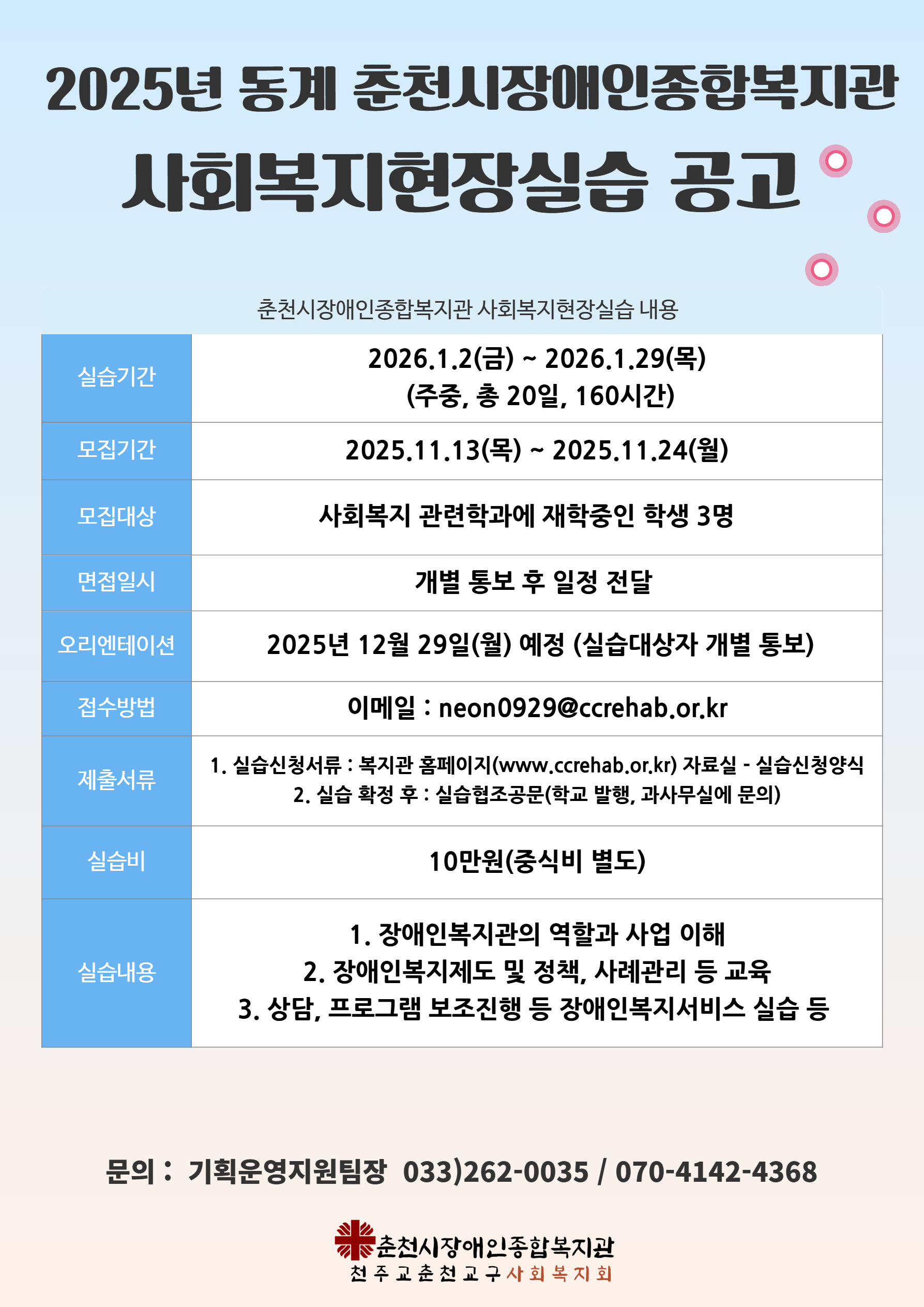 [2026-동계] 춘천시장애인종합복지관 사회복지현장실습생 모집 공고(~11.24.)