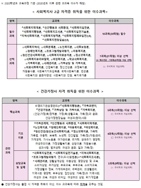 본 학과에서는 개인별 이수 교과목에 따라 사회복지사2급 및 건강가정사 자격이 주어집니다.