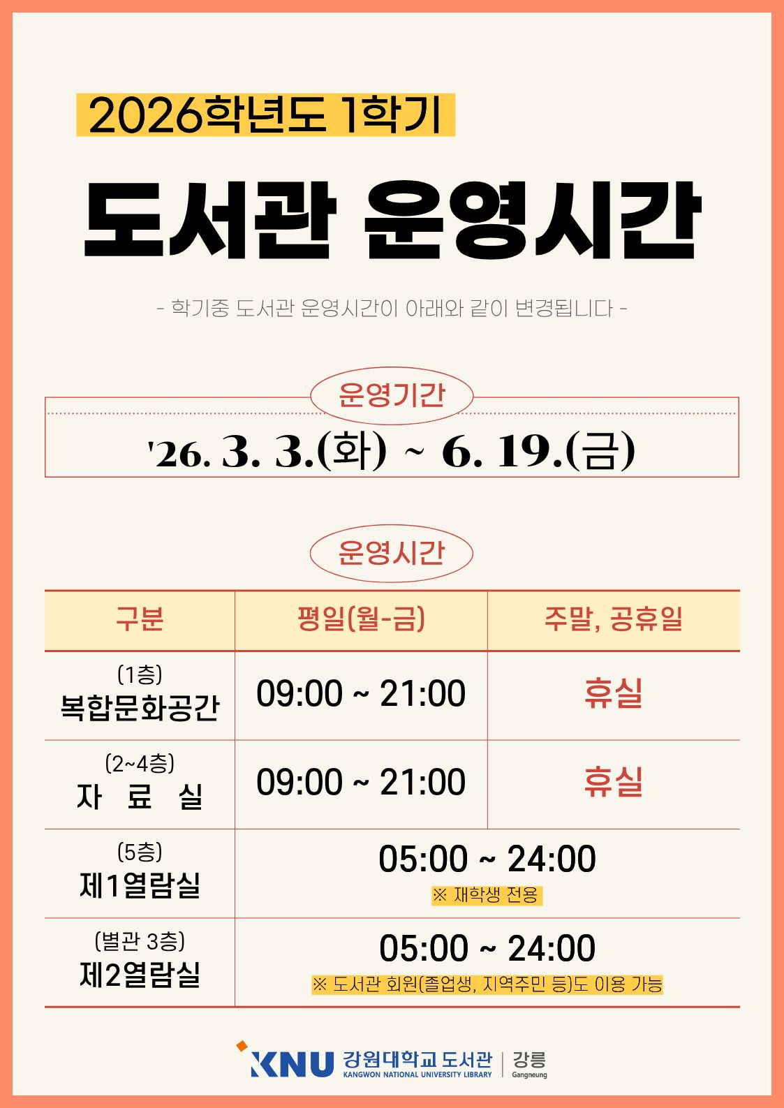 2026학년도 1학기 도서관 운영시간 변경 안내