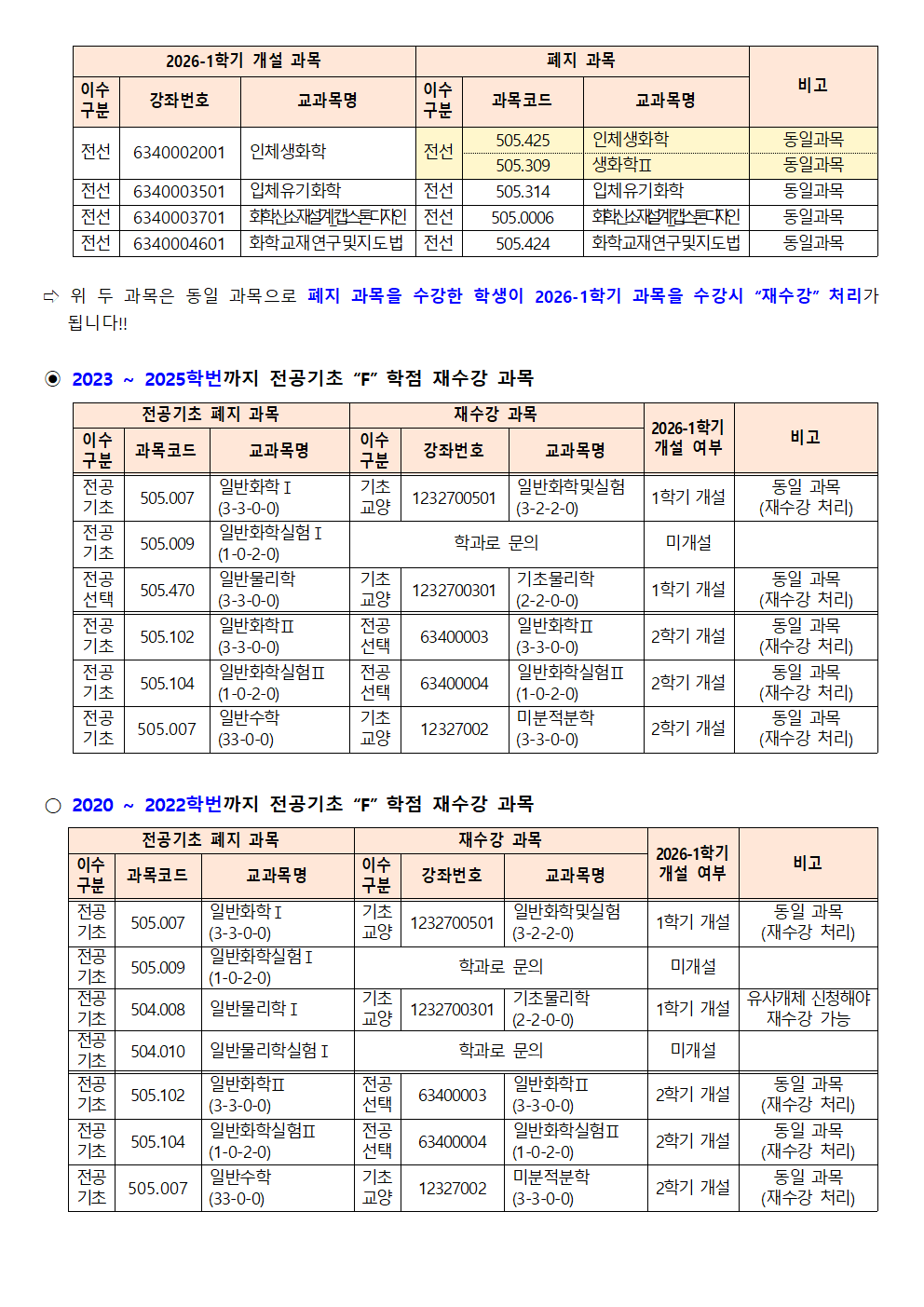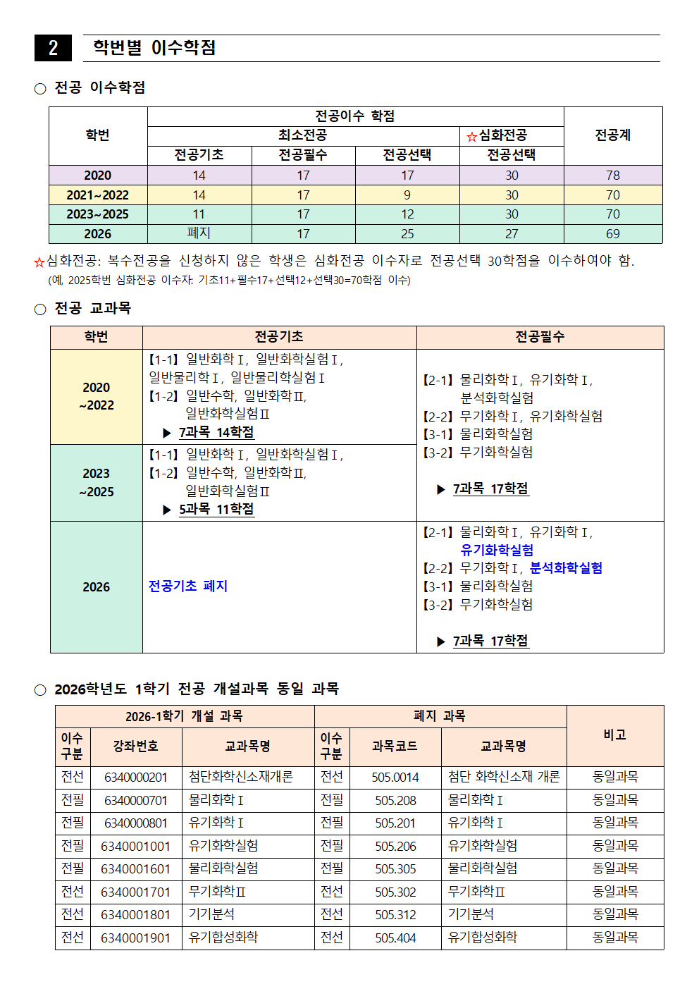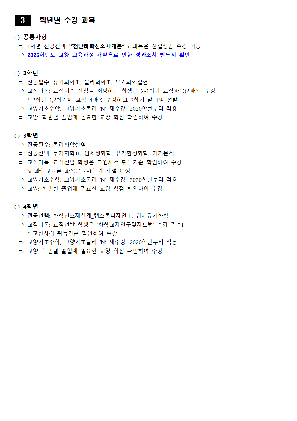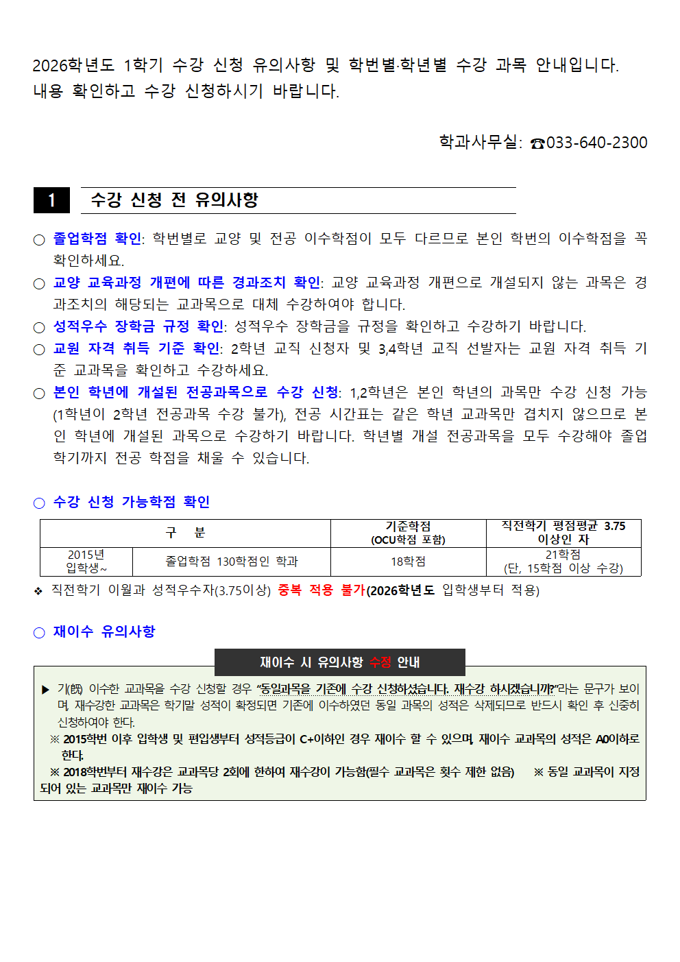 fnctId=bbs,fnctNo=562 [학부] 2026학년도 1학기 학년별 수강학신청 안내 작성일 2026.02.18 작성자 진미영 조회수 297 첨부파일 1. (2020~2025학번) 교육과정 이수기준표.pdf 4. 장학금 규정(학과).pdf 3. (2019~2024학번) 강릉원주대학교 비교과 활동 졸업인증 운영 규정.hwp 0. 2026학년도 1학기 교육과정 수강편람(최종).pdf 2. (교직이수자) 교원자격 무시험검정 합격기준.pdf