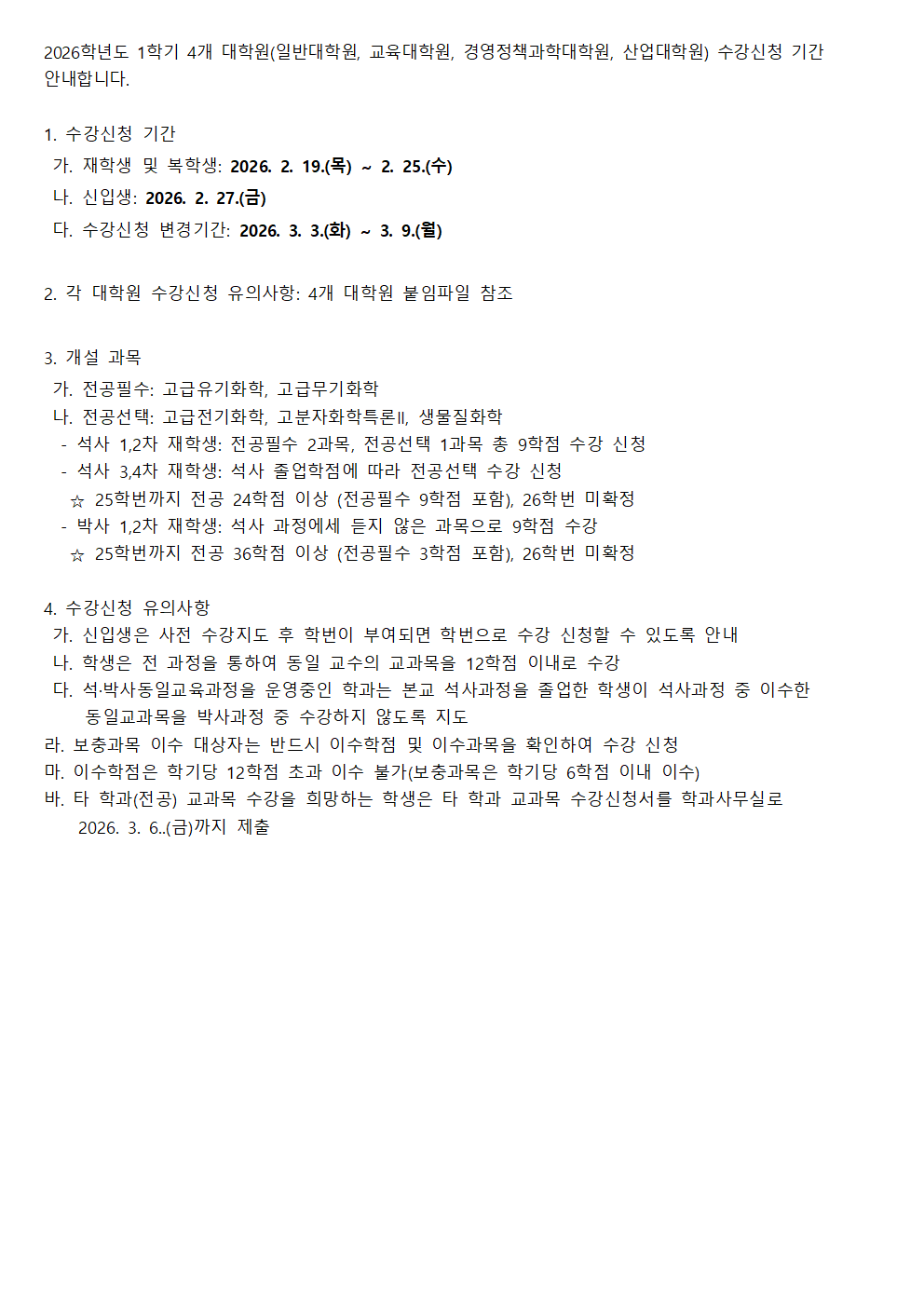 fnctId=bbs,fnctNo=562 [대학원] 2026학년도 1학기 일반대학원 수강신청 안내 작성일 2026.02.18 작성자 진미영 조회수 200 첨부파일 4개 대학원 수강신청 유의사항 안내.hwp 타 학과 타 전공과목수강 신청서.hwp