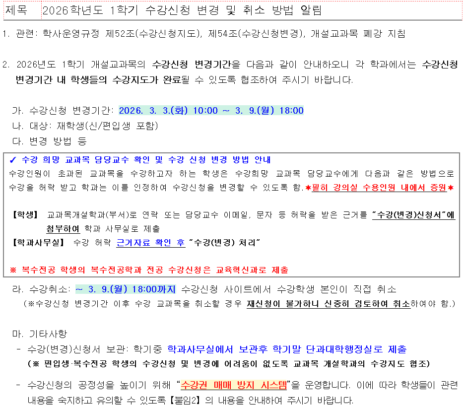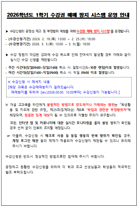 fnctId=bbs,fnctNo=880 2026학년도 1학기 수강신청 변경 및 취소 방법 알림 작성일 2026.02.26 작성자 홍승연 조회수 142 첨부파일 첨부파일이(가) 없습니다.