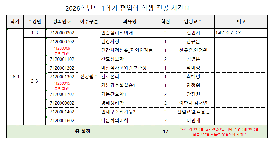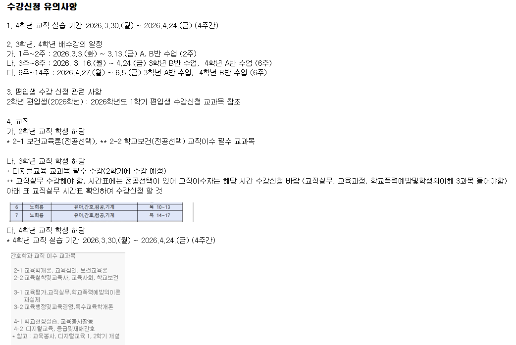 fnctId=bbs,fnctNo=840 2026학년도 1학기 전공 시간표 안내 드립니다. 작성일 2026.01.28 작성자 원민정 조회수 654 2026학년도 1학기 전공 시간표 안내 드립니다. * 수강신청 분반 추후 공지 예정 수강 신청시 유의 사항 첨부파일 2026-1 간호학과 전공 교과목 개설 시간표(20250121) - 학생공지용.xlsx