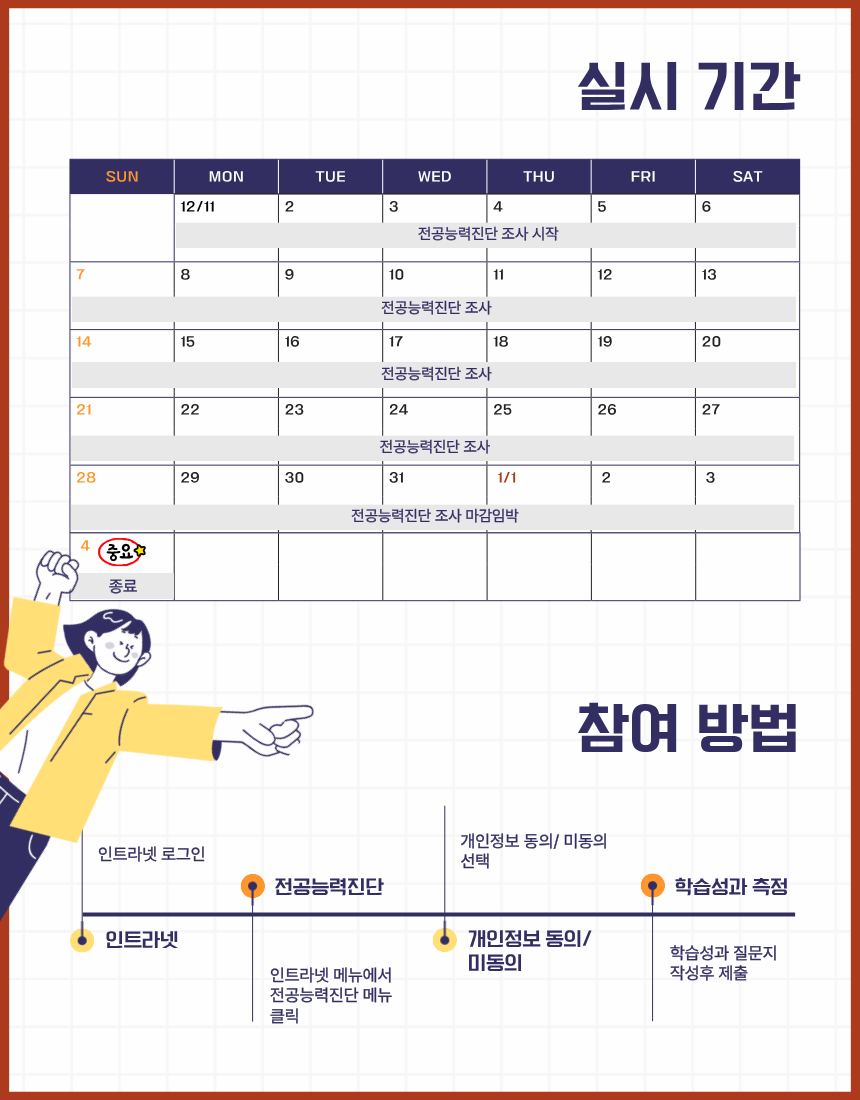 fnctId=bbs,fnctNo=728 2025학년도 전공능력진단 실시 안내(~2026.1.4.(일)까지) 작성일 2025.12.05 작성자 최은영 조회수 357 첨부파일 첨부파일이(가) 없습니다. 다음글 [학생성공지원과] 2025-비교과 프로그램 참여 후기 공모전 안내 최은영 2025-12-05 09:50:29.0 이전글 2025년도 하반기 대학 만족도 조사 실시 안내 최은영 2025-12-05 09:47:59.0